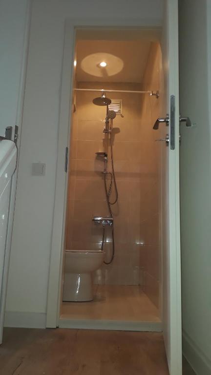 Bathroom 2 (2nd floor): Small sink, mirror, cupboard and wall faced boxed rim toilet suite toilet and shower